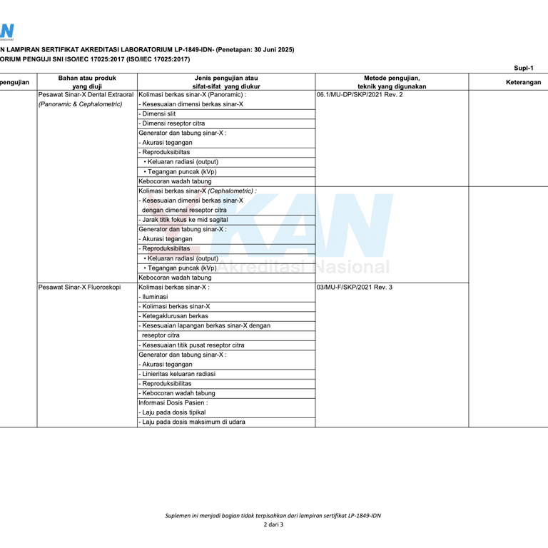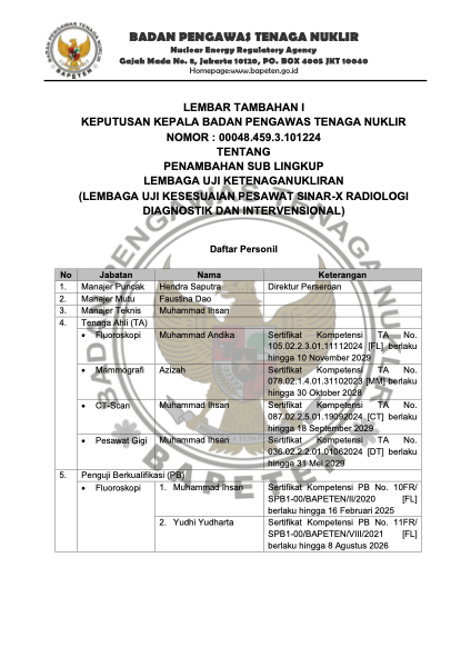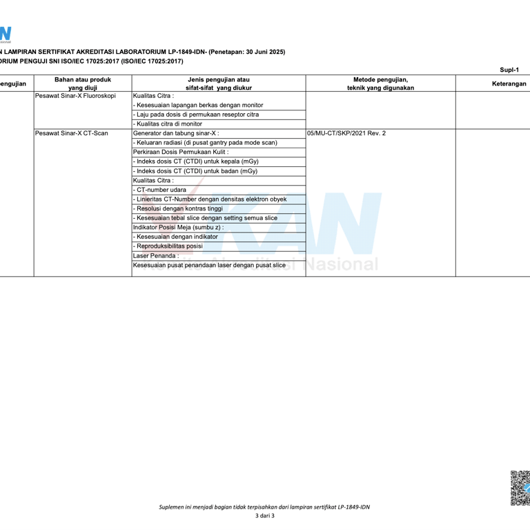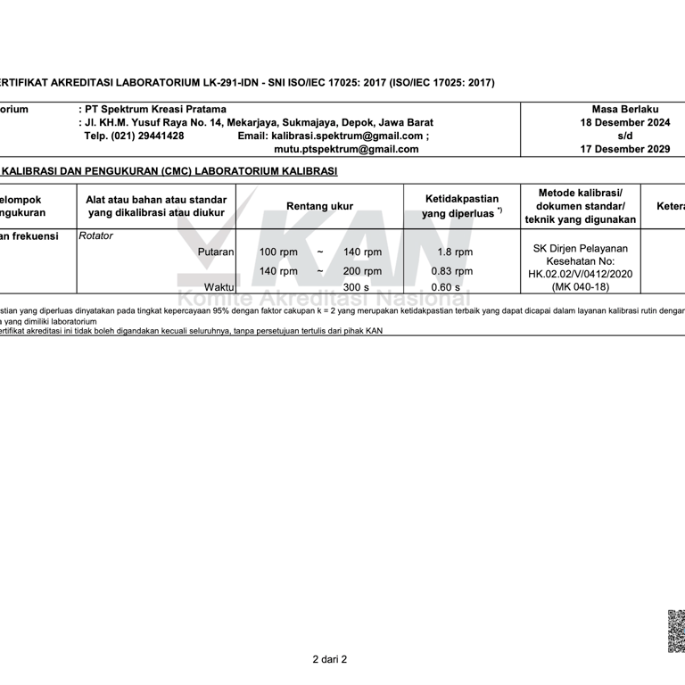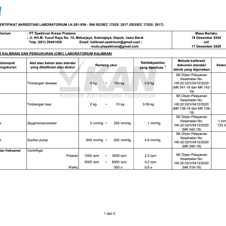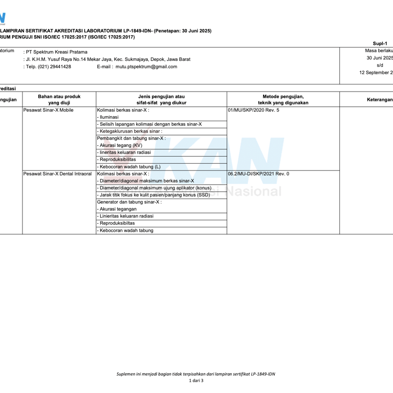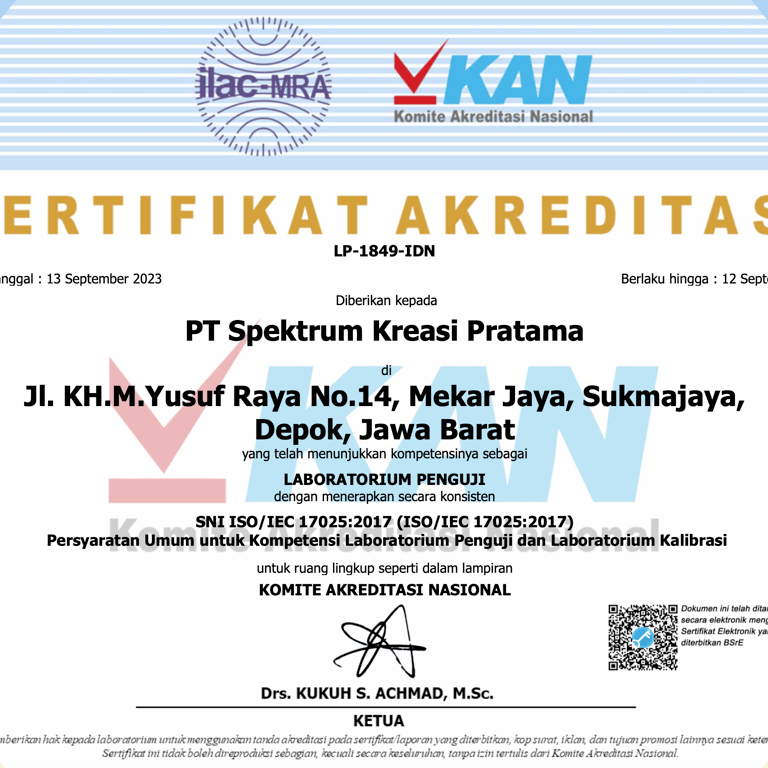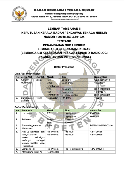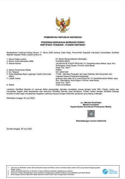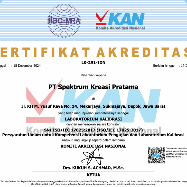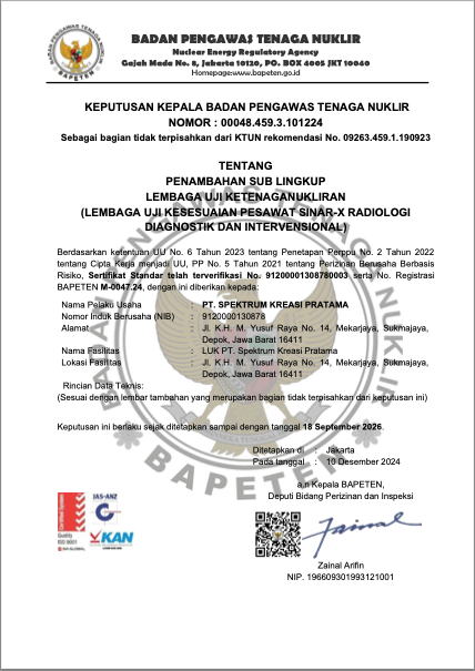Spektrum Kreasi Pratama telah resmi memiliki izin operasional serta sertifikat kompetensi dari BAPETEN dan Komite Akreditasi Nasional (KAN), sehingga setiap layanan kalibrasi dan uji kesesuaian yang kami lakukan terjamin akurasinya, berstandar nasional, serta diakui secara resmi oleh lembaga berwenang.